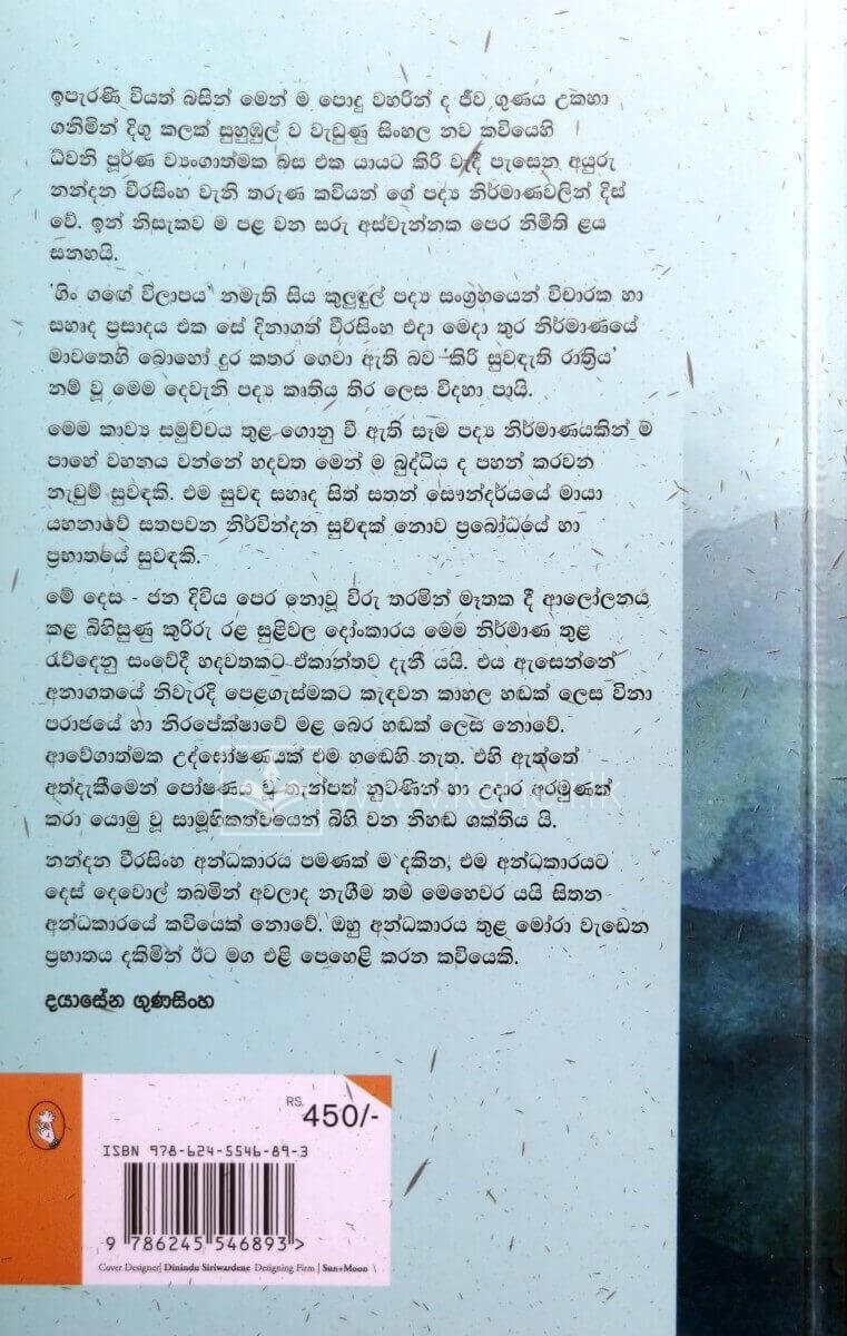 ඉපැරණි වියත් බසින් මෙන් ම පොදු වහරින් ද ජීව ගුණය උකහා ගනිමින් දිගු කලක් සුහුඹුල් ව වැඩුණු සිංහල නව කවියෙහි ධ්වනි පූර්ණ ව්යංගාත්මක බස එක යායට කිරි වැඳි පැසෙන අයුරු නන්දන වීරසිංහ වැනි තරුණ කවියන්ගේ පද්ය නිර්මාණ වලින් දිස් වේ. ඉන් නිසැකව ම පළවන සරු අස්වැන්නක පෙර නිමිති ළය සනහයි.